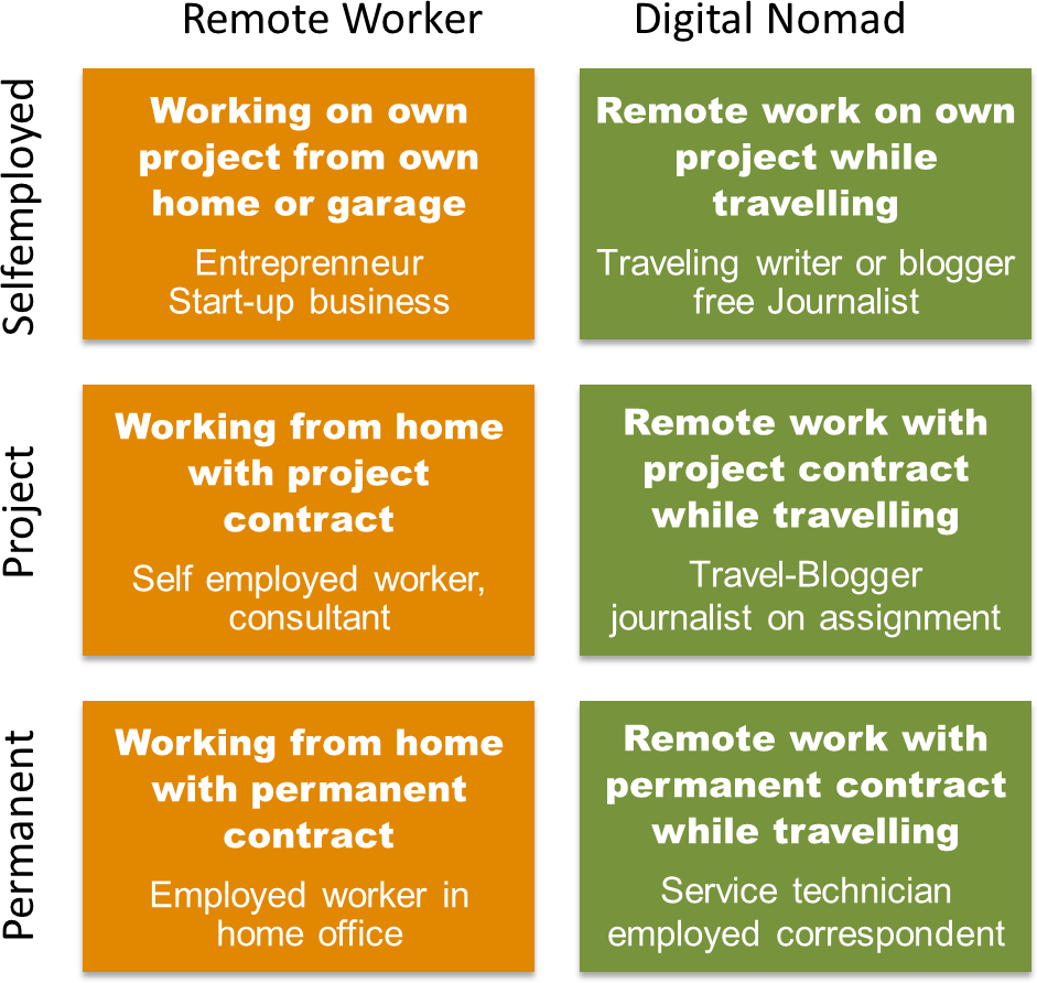 Remote work, also called distance work, telework, working from home (WFH), mobile work, remote jobs, and work from anywhere (WFA) is an employment arrangement in which employees do not commute to a central place of work, such as an office building, warehouse, or retail store. It is facilitated by technology such as collaborative software, local area networks, virtual private networks, conference calling, videotelephony, internet access, cloud computing, voice over IP (VoIP), mobile telecommunications technology such as a Wi-Fi-equipped laptop or tablet computers, smartphones, and desktop computers with landline phones. It can be efficient and useful for companies since it allows workers to communicate over long distances, saving significant amounts of travel time and cost. Digital nomads are people who conduct their life in a nomadic manner while engaging in remote work using digital telecommunications technology. Such people generally have minimal material possessions and work remotely in temporary housing, hotels, cafes, public libraries, co-working spaces, or recreational vehicles, using Wi-Fi, smartphones or mobile hotspots to access the Internet. Some digital nomads are perpetual travelers, while others are only nomadic for a short period of time. While some nomads travel through various countries, others focus on one area. Some may engage in vandwelling. In 2020, a research study found that 10.9 million American workers described themselves as digital nomads, an increase of 49% from 2019. Digital nomads are often younger remote workers, backpackers, retired or semi-retired persons, snowbirds, and/or entrepreneurs.